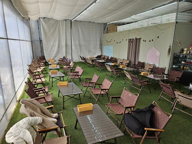 안으로 들어가면 앉아서 딸기를 먹거나 잠시 쉬어갈 수 있는 공간이 마련되어 있어요. 한쪽에는 딸기를 씻을 수 있는 장소도 있어서 수확 후 바로 이용하기 편했습니다.